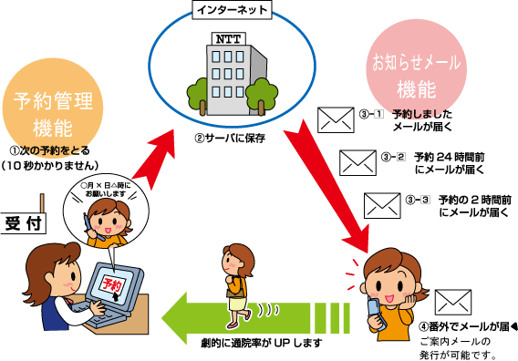 | お客様も「あっ、忘れていた」と後になって必ず気付きます。 そんなときは、申し訳ない気持ちでいっぱいで、次に電話をするのが、ためらわれるでしょう。 そこで、メールを出してあげることによって、予約を思い出してもらい、 また、キャンセルの場合もお電話がすぐできるようにしてあげることによって、再来院もしやすくなります。 |